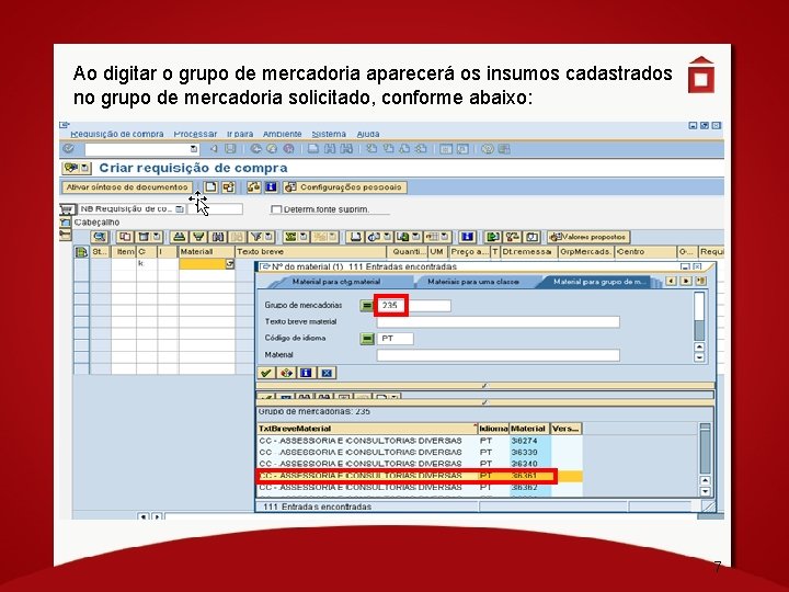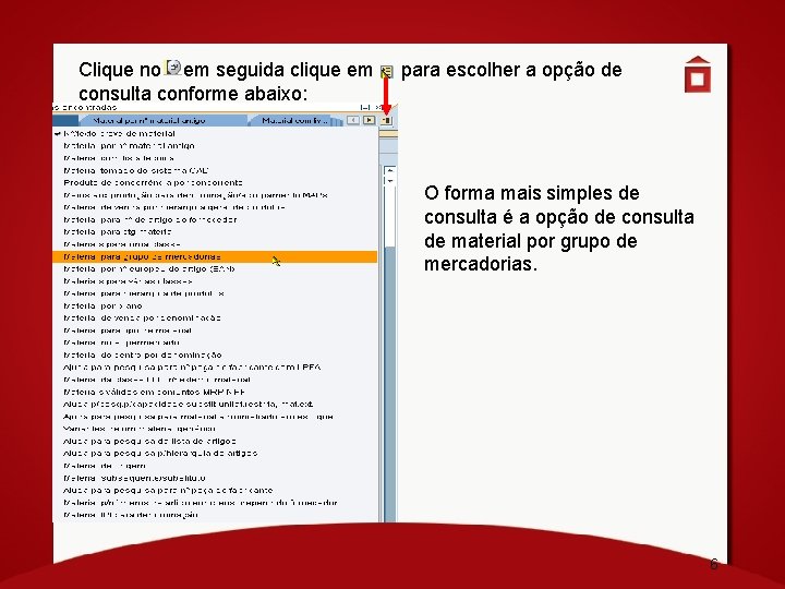 Clique no em seguida clique em para escolher a opção de consulta conforme abaixo: O forma mais simples de consulta é a opção de consulta de material por grupo de mercadorias. 6