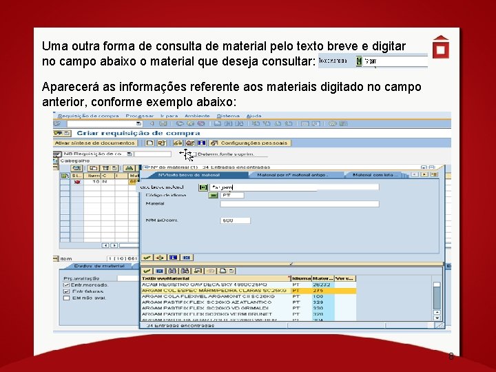 Uma outra forma de consulta de material pelo texto breve e digitar no campo abaixo o material que deseja consultar: Aparecerá as informações referente aos materiais digitado no campo anterior, conforme exemplo abaixo: 8