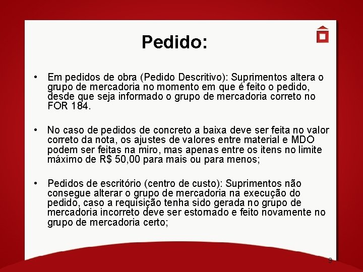 Pedido: • Em pedidos de obra (Pedido Descritivo): Suprimentos altera o grupo de mercadoria no momento em que é feito o pedido, desde que seja informado o grupo de mercadoria correto no FOR 184. • No caso de pedidos de concreto a baixa deve ser feita no valor correto da nota, os ajustes de valores entre material e MDO podem ser feitas na miro, mas apenas entre os itens no limite máximo de R$ 50, 00 para mais ou para menos; • Pedidos de escritório (centro de custo): Suprimentos não consegue alterar o grupo de mercadoria na execução do pedido, caso a requisição tenha sido gerada no grupo de mercadoria incorreto deve ser estornado e feito novamente no grupo de mercadoria certo; 9