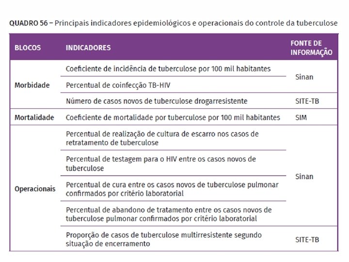 Análise de dados do Sinan • Os dados gerados no Sinan permitem o cálculo de indicadores operacionais e epidemiológicos importantes para a análise do perfil epidemiológico da tuberculose no país e para o monitoramento e avaliação das ações de controle. • Para que as informações se tornem efetivamente úteis, é imprescindível que análises de qualidade das bases de dados (completitude, consistência, duplicidade e vinculação de registros) sejam efetuadas regularmente.