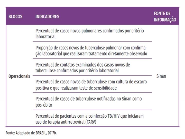 Indicadores pactuados • Percentual de cura entre os casos novos de tuberculose pulmonar confirmados por critério laboratorial; • Percentual de testagem para o HIV entre os casos novos de tuberculose; • Percentual de contatos examinados casos novos de tuberculose confirmados por critério laboratorial.