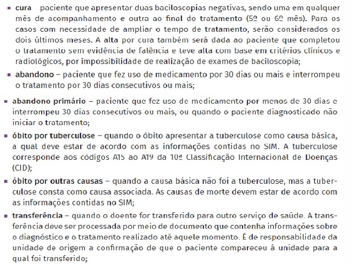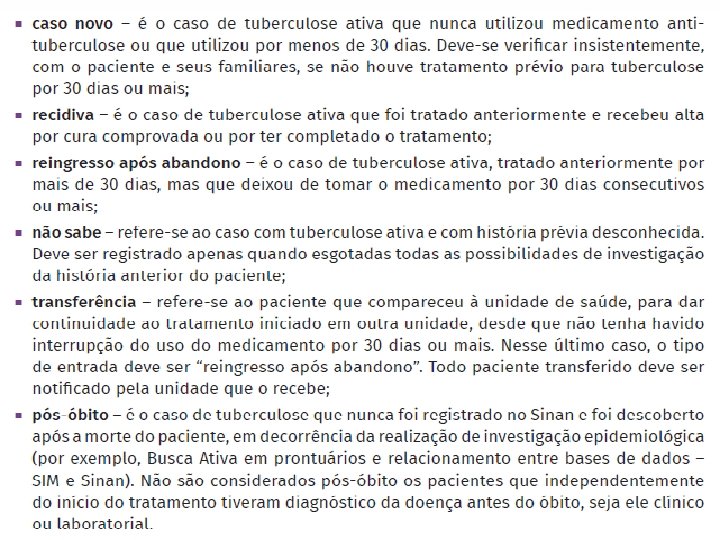Na vigilância da Tuberculose temos: • Caso suspeito de tuberculose; • Caso confirmado de tuberculose: – Critério laboratorial; – Critério clínico; • Caso descartado.