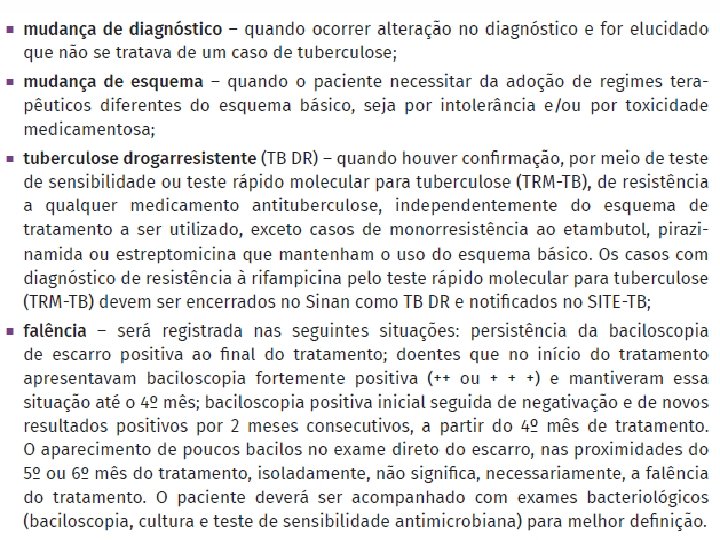Indicações para a ampliação do tempo de tratamento: • Pacientes com baciloscopias de acompanhamento negativas, com evolução clínica e/ou radiológica insatisfatórias; • Pacientes com baciloscopia positiva (poucos bacilos) no quinto ou sexto mês de tratamento, isoladamente, com boa evolução clínica e radiológica. Investigar a possibilidade de TB resistente; • Pacientes com apresentação radiológica evidenciando múltiplas cavidades, especialmente se exibem baciloscopia positiva ao final do segundo mês de tratamento. Investigar a possibilidade TB resistente.
