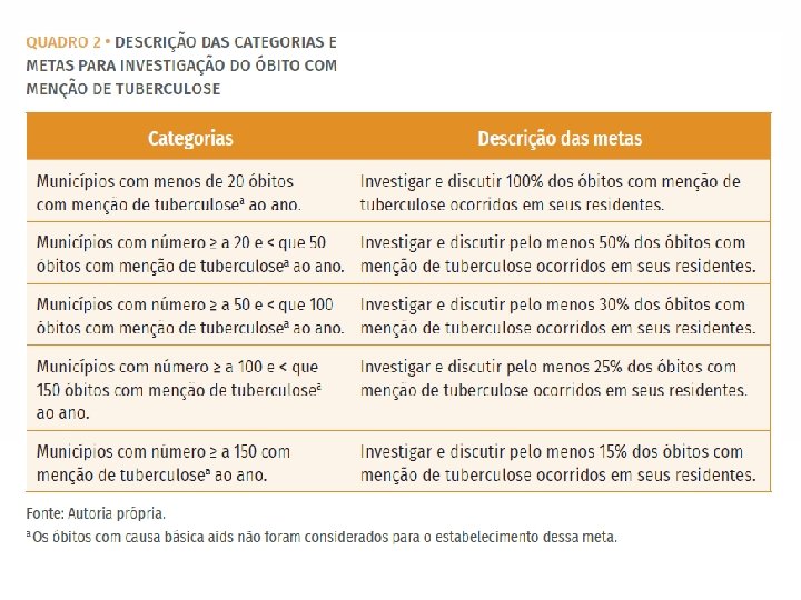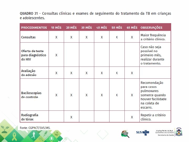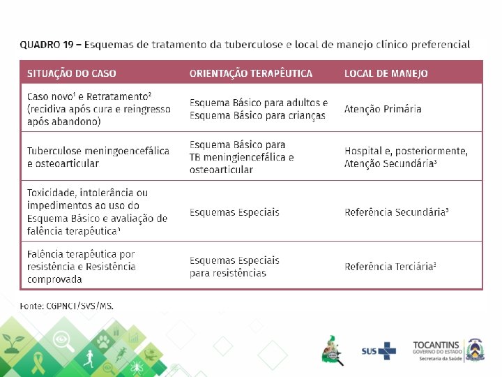 ESTRATÉGIA PELO FIM DA TUBERCULOSE • Para atingir as metas estabelecidas até 2035 é necessário: – Redução do coeficiente de Aids para 10/100. 000; • Tocantins 2018: 4, 25/100. 000 – Aumento da cobertura da ESF para 90%; • Tocantins 2018: 94, 62% – Realização do TDO até 90%. • Tocantins 2018: 55, 55% (Fonte: SINAN / SES-TO em 04/09/19)