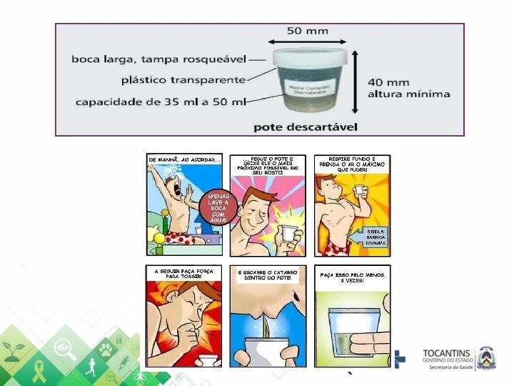 Quando o paciente referir ausência de expectoração, o profissional de saúde deverá orientá-lo sobre como obter uma adequada amostra de escarro para exame. Quando disponível, a indução do escarro pode ser realizada.