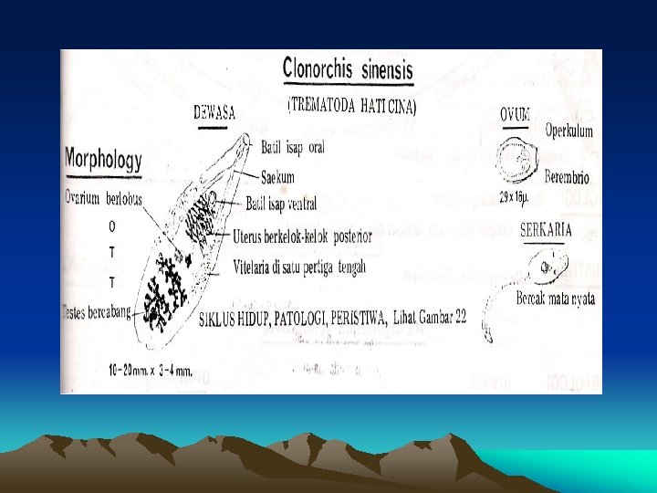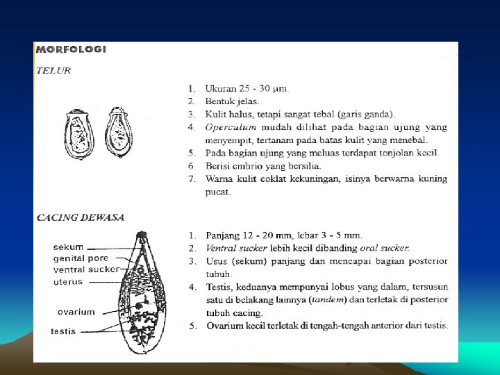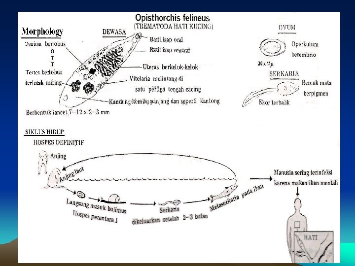 Morfologi dan Siklus Hidup • • Habitat : sal. empedu dan sal. pankreas. Ukuran 7 – 12 mm Batil isap mulut > batil isap perut Telur : mirip telur C. sinensis, tapi lebih langsing • Cara infeksi: makan ikan yang mengandung metaserkaria yg dimasak kurang matang.
