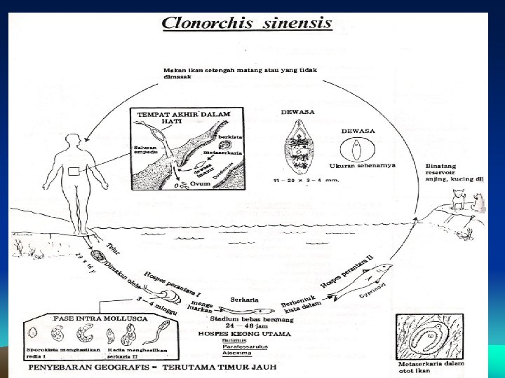 • Habitat : saluran empedu hati dan sal. pankreas • Hospes perantara I : keong Bulimus, Alocinma, Parafossarulus • Hospes perantara II : ikan Cyprinoid • Cara infeksi : makan ikan yang mengandung metaserkaria yang tidak dimasak dengan baik. • Seluruh siklus hidup berlangsung selama 3 bulan.