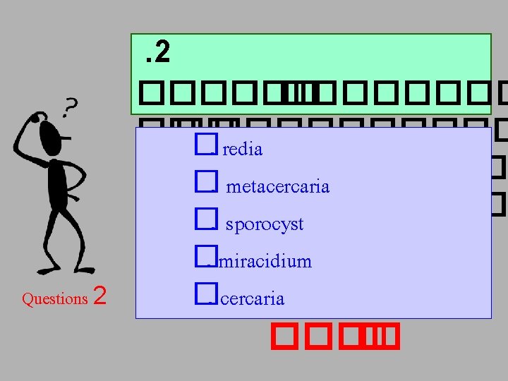 ���� : �. 1������ �. �������� hermaphodrite �. ������� posterior sucker ��� ventral Questions 1 sucker �. Flame cell �������� intestinal caeca