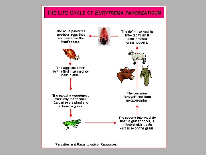 Life cycle • one intermediate host: Lymnaea, Indoplanorbis • cercaria: eye spots, “amphistome” • young adult: small intestine ---> reticulum, rumen