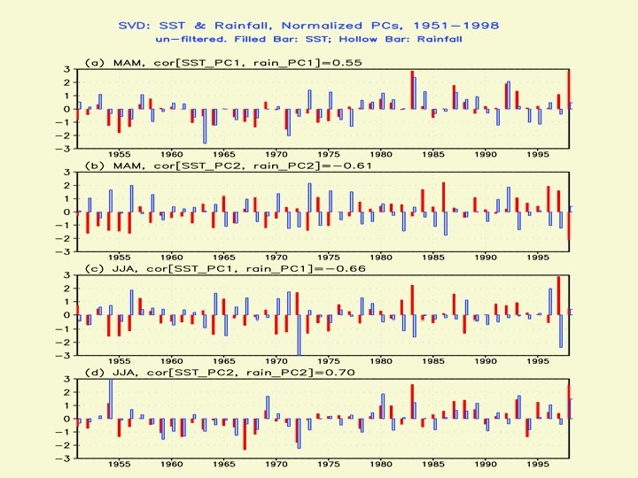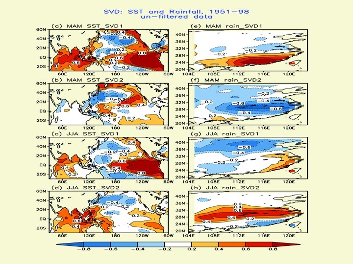 SST Variance Precipitation Variance SSTPrecipitation Co-Variance Correlation (PC_sst, PC_precip) MAM SVD 1 31% 27% 0. 57 SVD 2 11% 15% 14% 0. 64 JJA SVD 1 43% 10% 24% – 0. 77 SVD 2 7% 13% 0. 76