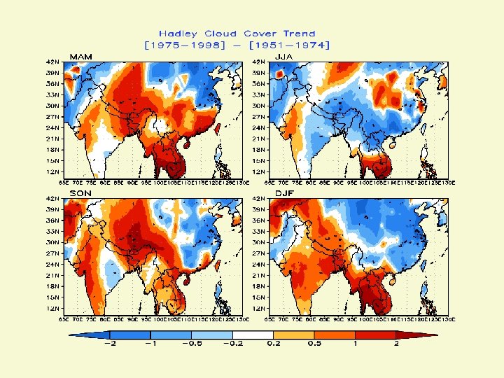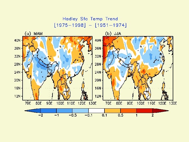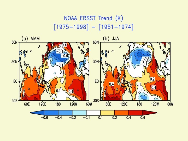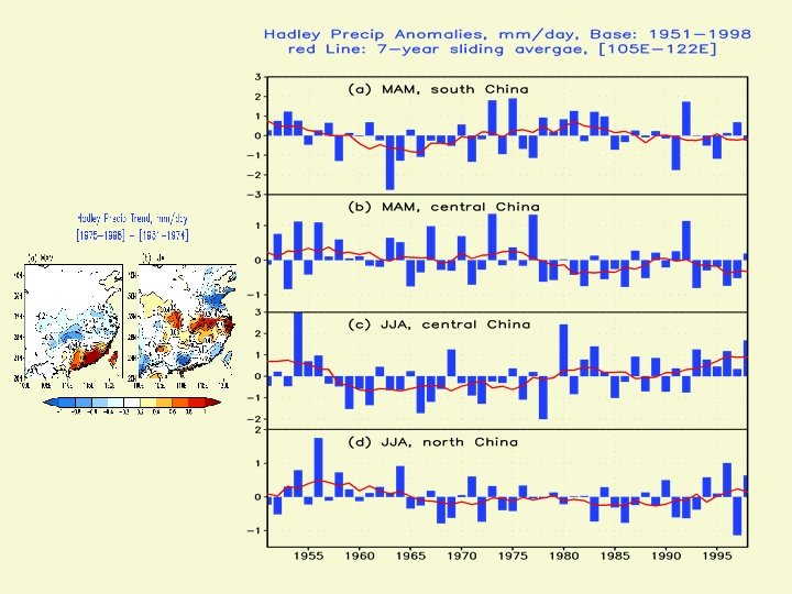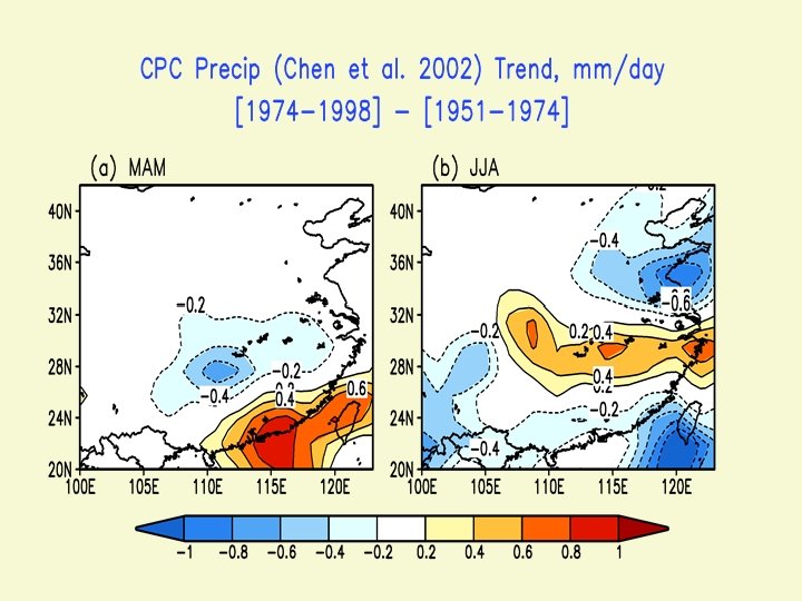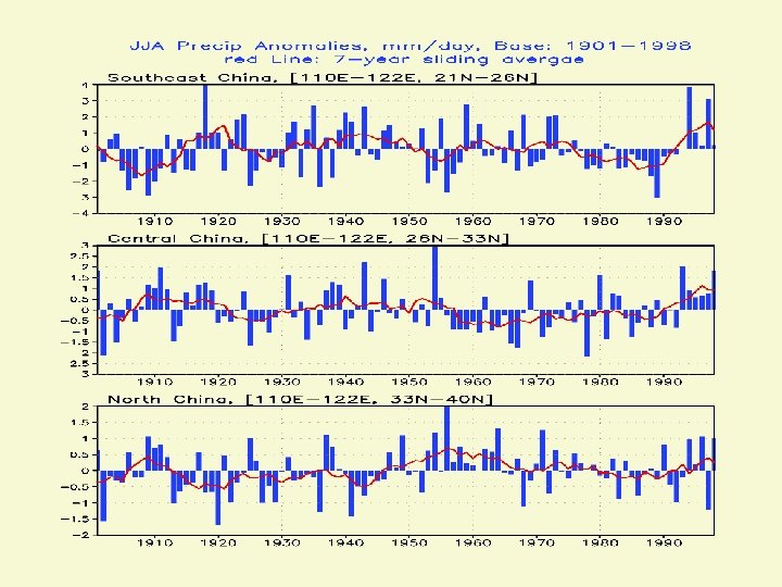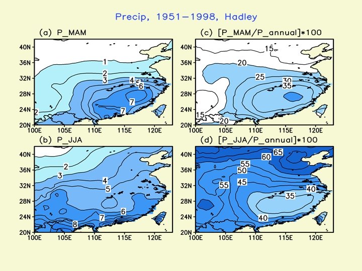 Conclusion Interannual Variability • Precipitation over South China in MAM and North China in JJA ENSO mode of SSTs • • Precipitation over central China in both MAM and JJA season SST in warm pool and northern Indian ocean; Features of the anomalous 850 h. Pa winds and 700 -h. Pa geopotential height corresponding to these modes support a physical mechanism that explains the causal links between the modal variations of precipitation and SSTs. Trend and decadal variation • Upward South China MAM precipitation and downward JJA North China precipitation warming trend of the ENSO-like mode. • Upward JJA central China precipitation warming trend of SSTs over the warm pool and Indian Ocean. • Downward MAM South China precipitation downward central North Pacific SSTs (less robust)