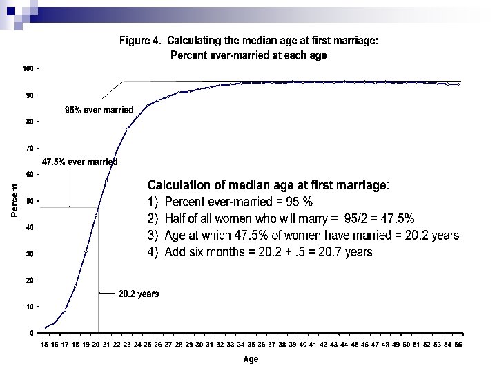 To investigate differentials, we shift our measures from median marriage and marriage distribution to percent of young people never married. n The indirect median age at marriage is unreliable in periods of rapid change (this is particularly important for answering question 3). n It also doesn’t allow us to look at differentials between most population subgroups, since people change their characteristics as they age. Here is how the indirect median is calculated:
