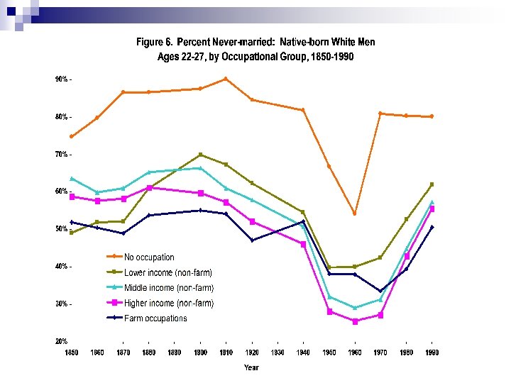 Hypotheses, continued n These theories predict a positive association between male economic opportunity and early marriage, and an inverse association for female opportunity. n Historically, these relationships have been strong, but recent evidence that the relationship may have reversed for women (e. g. Oppenheimer and Lew 1995)