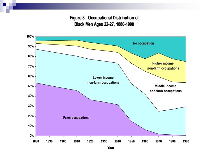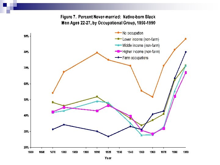 Conclusions n The absence of a post-war marriage boom for blacks is connected to the dislocation associated with the precipitous decline of farming. n There a lot of possible explanations for the extraordinary rise in marriage between 1970 and 1990, and we have a plan for investigating them. n We really don’t have a clue about why there was a marriage boom after 1990 among non-employed and institutionalized black men.