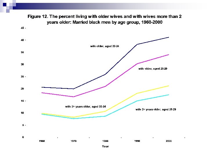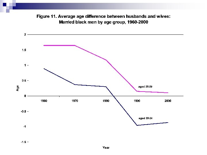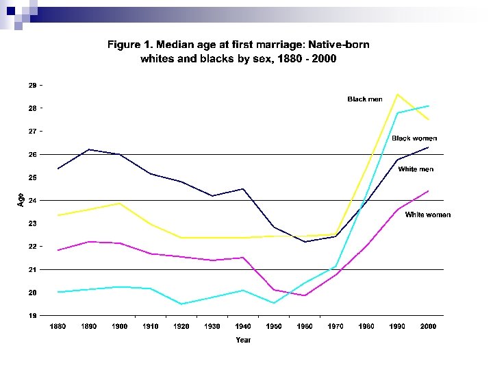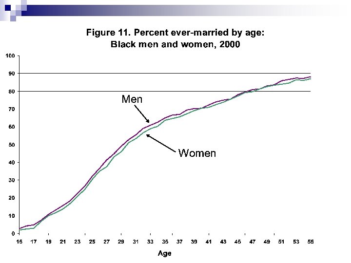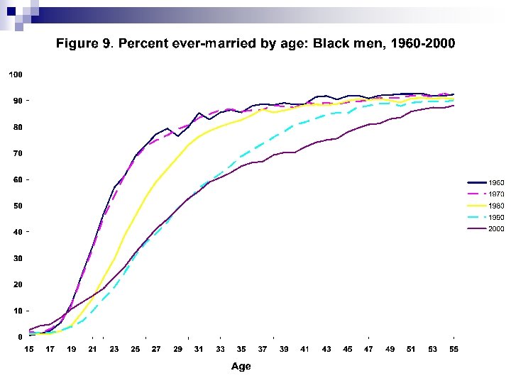 Black male age pattern of marriage For men, the pattern in 2000 differs from previous years in two ways. n First, young men (aged 17 -26) are more likely to be married than in 1990. n Second, the percent of men older than 35 years who remained never-married was higher than in any prior census year.