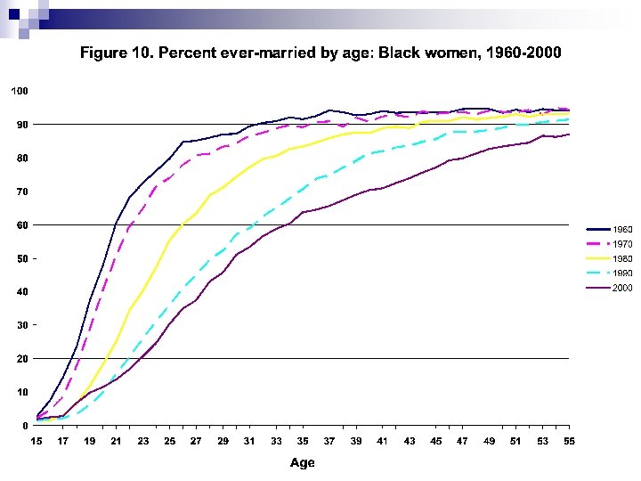 Black female age pattern of marriage n The pattern for women in 2000 suggests a slight increase in the percent of very young women (aged 1821) ever-married. n There was a significant decrease in the percent of women ever-married at every other age. n Magnitude of change since 1960 is extraordinary.