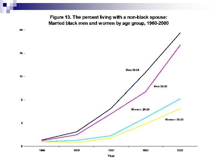 Intermarriage n Young black men are out-marrying at very high rates (much higher than among women), allowing marriage formation to increase for black men and to continue to decline for black women. n In all years and both age groups, black men married nonblack women at least twice as often as black women married non-black men. n The increase in intermarriage between 1990 and 2000 was much greater for men than for women.