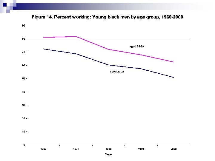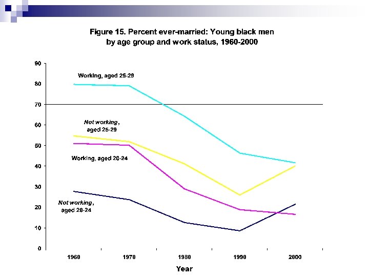 The effect of male employment disappeared n Even more surprising, the traditional relationship between employment and marriage disappeared in 2000. n Among young black men who worked, marriage continued to decline between 1990 and 2000.