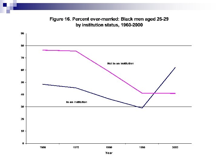The rise in marriage for black men was confined to those who were not employed n Further investigation of the characteristics of the nonworking married population revealed that many were living in institutions. n In 2000, the percent ever-married among men in institutions increased dramatically, and the percent evermarried among the non-institutional population was virtually unchanged.