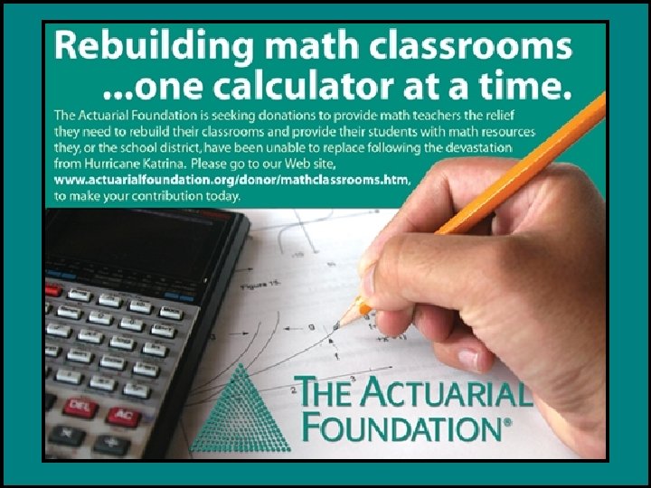 BECOME A DONOR TODAY Your gifts are an investment in both the public interest and the actuarial profession for today and in preparing for tomorrow’s possibilities. PLEASE JOIN US IN MAKING A DIFFERENCE IN THE MATH EDUCATION OF TODAY’S STUDENTS! Give online at the Foundation’s secure Web site: http: //www. actuarialfoundation. org/donor. htm