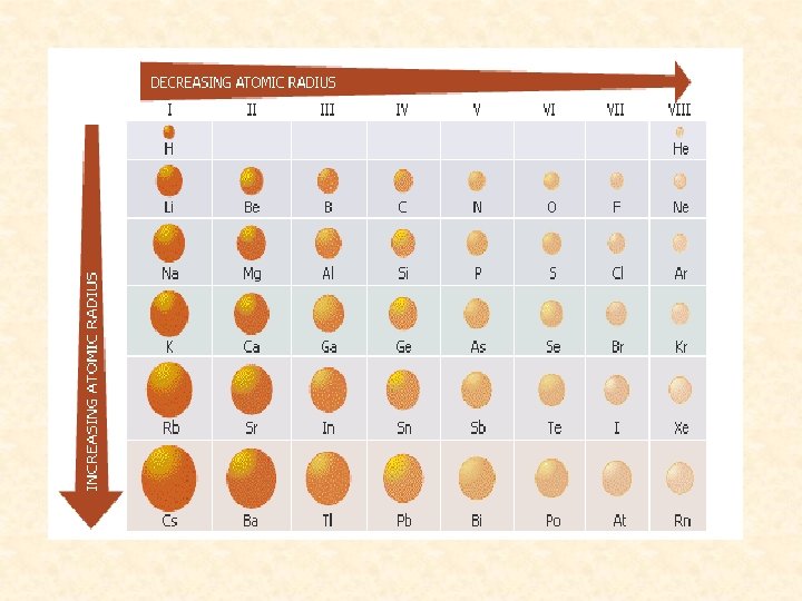Trends in Atomic Radius • Left to right: decreasing atomic radius • Reason: # of protons is increasing Ø Stronger attraction of electrons since there are more protons Ø So distance between nucleus and electrons decreases