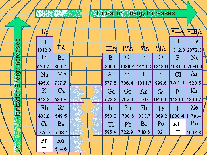 Ionization Energy Trends n Period - ionization energy increases as you go from left to right across a period. n Why? Extra p+s & no extra shielding leads to a stronger hold on the outer electrons.