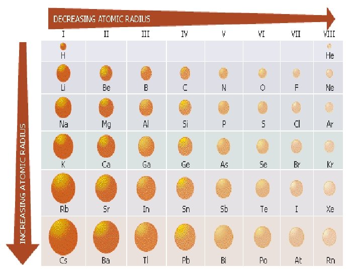 Trends in Atomic Size n Period - atomic radius decreases as you go from left to right across a period. n Why? Extra protons in the nucleus create a stronger force of attraction on the outer electrons.
