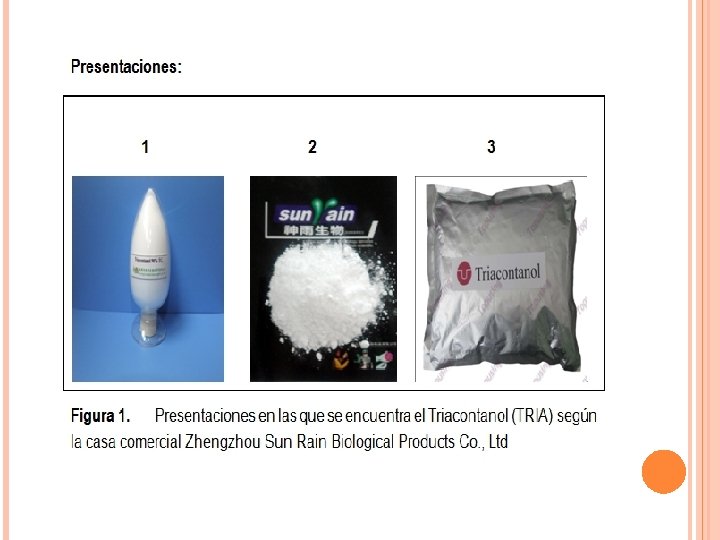 v. La estimulación del crecimiento en las plantas por parte de las propiedades del TRIA se demostró por primera vez por Crosby y Vlitos en 1959, y más tarde Ries et al en 1977. v v. TRIA es un componente de las cera epiculares de la alfalfa (Chibnabal et al, 1983) v. Entre los estudios realizados por Ries et al 1977, se dilucida el (TRIA) como un alcohol primario saturado (n-C 30 -H 61 -OH), además manifiesta que TRIA es muy lipofílica y difíciles de formular. La mejor método de formulación es una dispersión coloidal con el sebo surfactante alquilo sulfato como un dispersante (Ries, 1985)