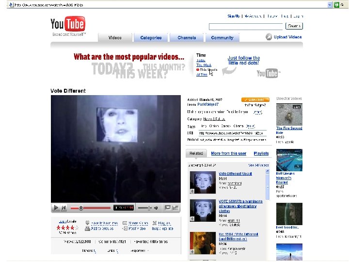 Right tools? n n Are we using the right tools and methods to measure political activity in the online environment? Ex. 1 2007 Youtube anti-Clinton video ‘Big Brother’ theme http: //www. youtube. com/watch? v=6 h 3 G-l. MZxjo n Ex. 2 2004 Jib. Jab Flash Cartoon ‘This Land’