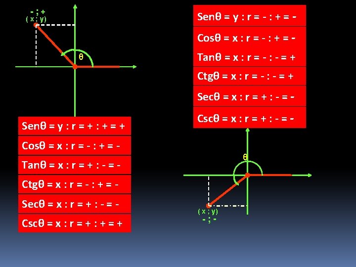 SIGNOS DE LAS RAZONES TRIGONOMÉTRICAS Como las razones trignométricas dependen de dos cantidades (abscisas, ordenadas y/o radio vector), nos percatamos que las razones trigonométricas tienen un signo que se obtiene de la combinación de los signos que poseen estas cantidades. +; + ( x ; y) Senθ = y : r = + : + = + Cosθ = x : r = + : + = + θ Tanθ = x : r = + : + = + Ctgθ = x : r = + : + = + Secθ = x : r = + : + = + Cscθ = x : r = + : + = +