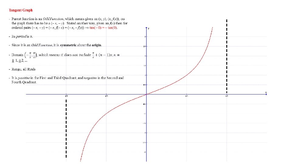 Cotangent Graph - Parent function is an Odd Function, which means given an (x, y), (x, f(x)), on the graph there has to be a (– x, – y). Stated another way, given an f(x) then for ordered pairs (– x, – y) = (– x, f(– x) = (– x, – f(x)) cot(– ) = – cot( ). - Its period is . - Since it is an Odd Function, it is symmetric about the origin. - Domain all Reals not to include multiples of - Range All Reals - It is positive in the First and Third Quadrant, and negative in the Second and Fourth Quadrant.