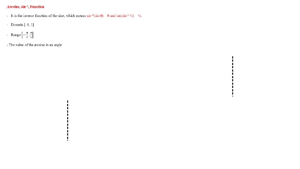 Arccosine, cos– 1, Function - It is the inverse function of the cosine, which means cos– 1(cos ) = and cos(cos– 1 ½) = ½. - Domain [– 1, 1] - Range [0, ] - The value of the arccosine is an angle.