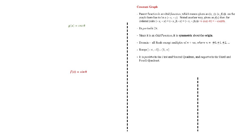 Sine Graph - Parent function is an Odd Function, which means given an (x, y), (x, f(x)), on the graph there has to be a (– x, – y). Stated another way, given an f(x) then for ordered pairs (– x, – y) = (– x, f(– x) = (– x, – f(x)) sin(– ) = – sin( ). - Its period is 2. - Since it is an Odd Function, it is symmetric about the origin. The Cosecant, the reciprocal of the Sine Function is also an Odd Function. - Domain - all Reals - Range [– 1, 1] - It is positive in the First and Second Quadrant, and negative in the Third and Fourth Quadrant.