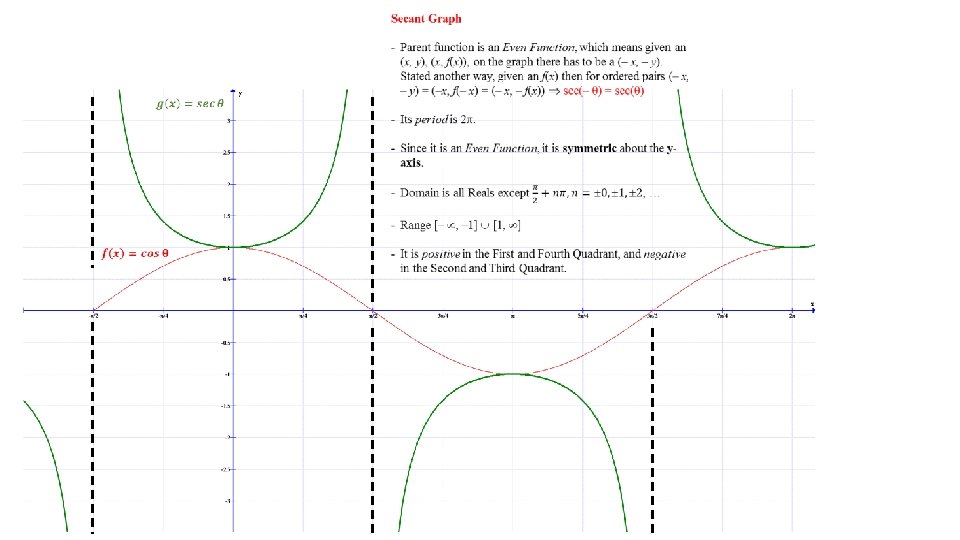 Cosine Graph - Parent function is an Even Function, which means given an (x, y), (x, f(x)), on the graph there has to be a (– x, y). Stated another way, given an f(x) then for ordered pairs (– x, y) = (– x, f(– x) = (– x, f(x)) cos(– ) = cos( ) - Its period is 2. - Since it is an Even Function, it is symmetric about the y-axis. The Secant, the reciprocal of the Cosine Function, is also an Even Function. - Domain - all Reals - Range [– 1, 1] - It is positive in the First and Fourth Quadrant, and negative in the Second and Third Quadrant