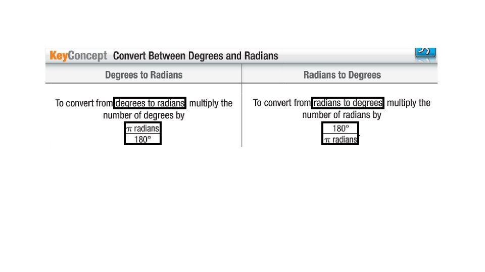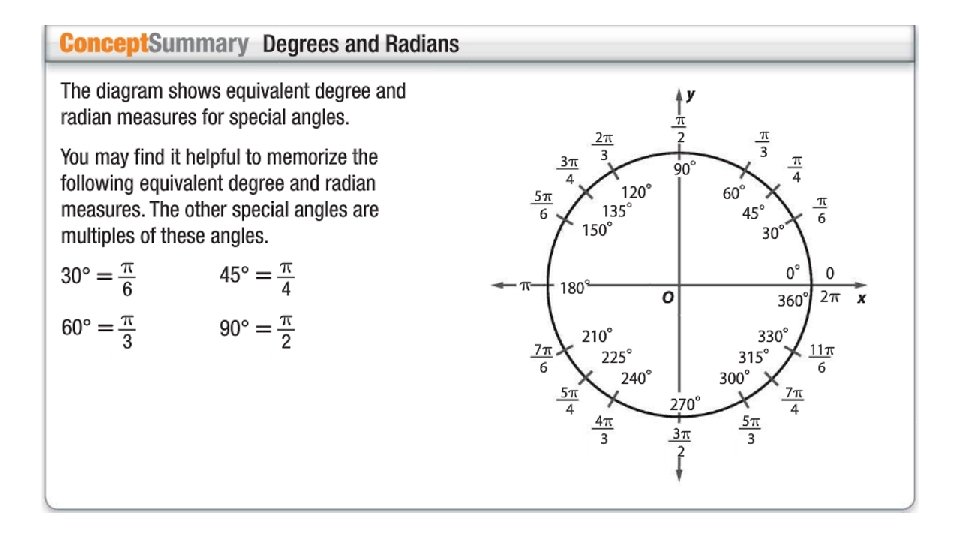 Converting Between Degrees and Radians • Angles can also be measured in units that are based on arc length • One radian is the measure of an angle θ in standard position with a terminal side that intercepts an arc with the same length as the radius of the circle • What is the circumference of a circle? • Then one complete revolution around a circle in 2π radians • Therefore, 2π radians = 360⁰ π radians = 180⁰