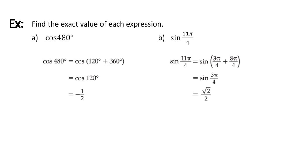 Ex: Find an angle with a positive measure and an angle with a negative measure that are coterminal with each angle. a) 130⁰ b) -200⁰
