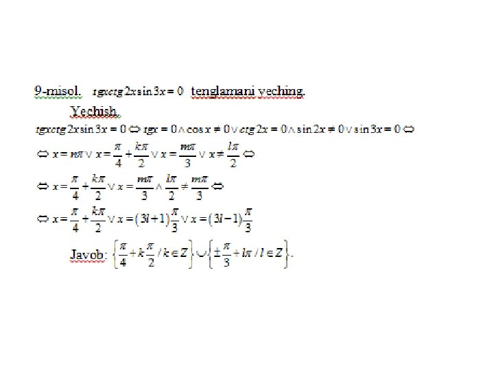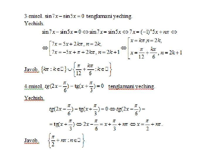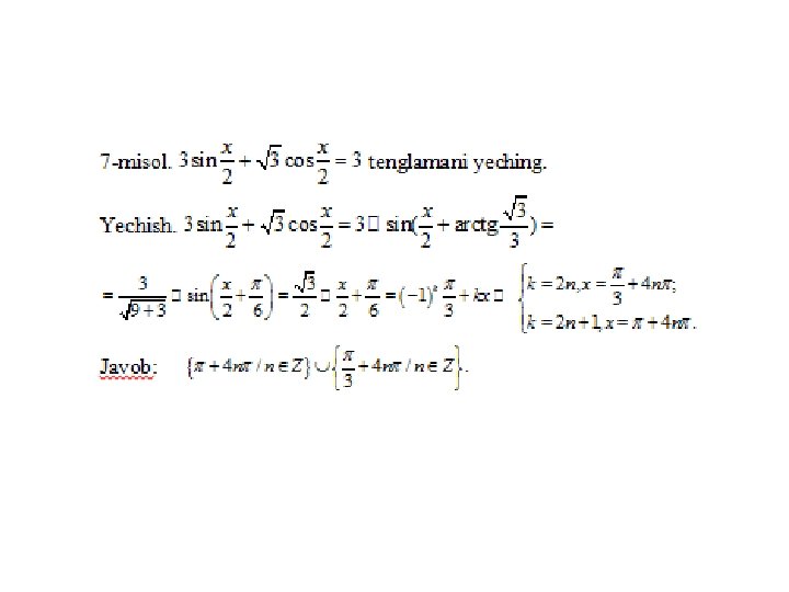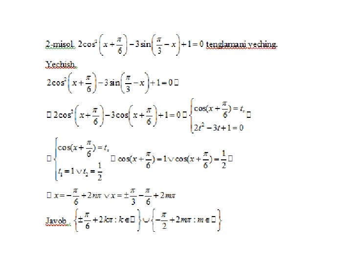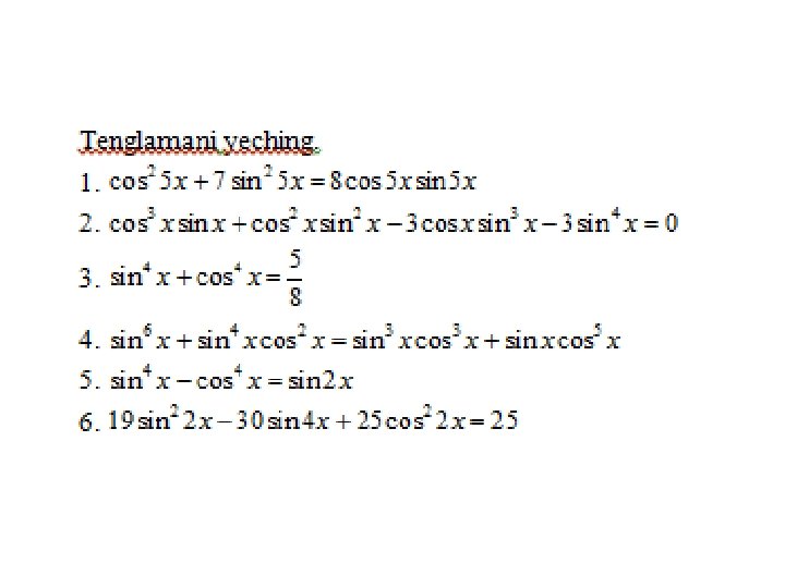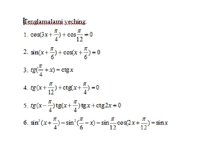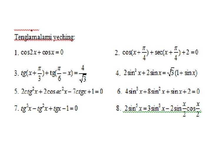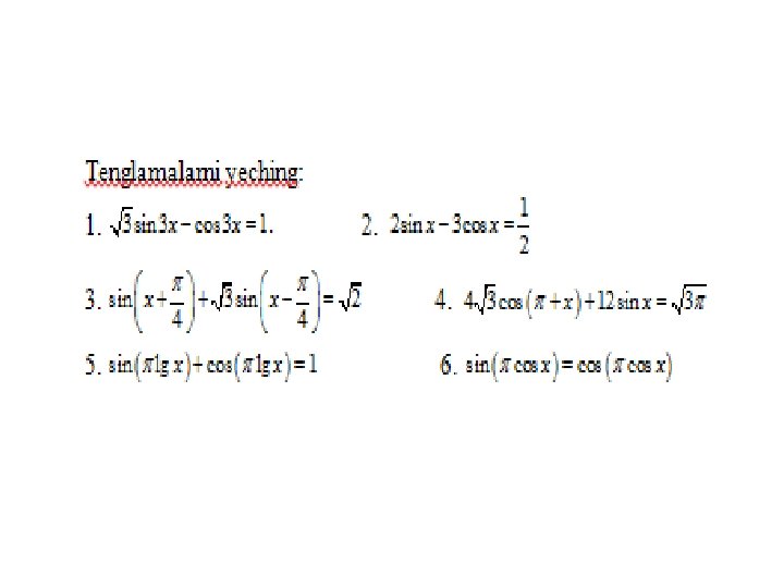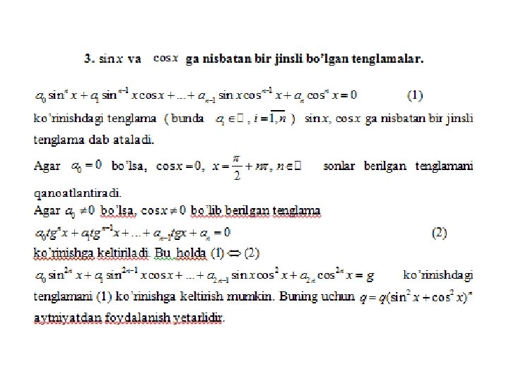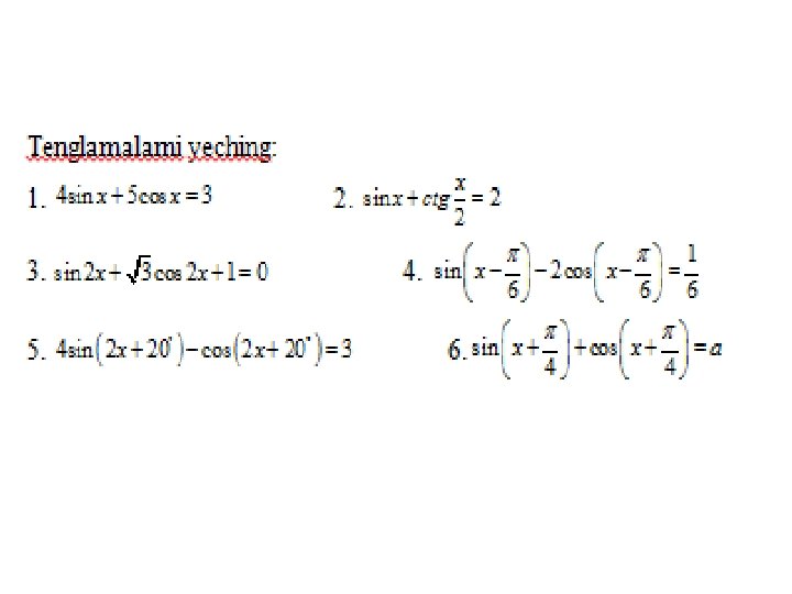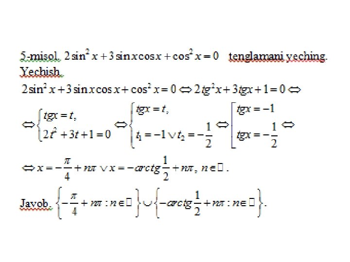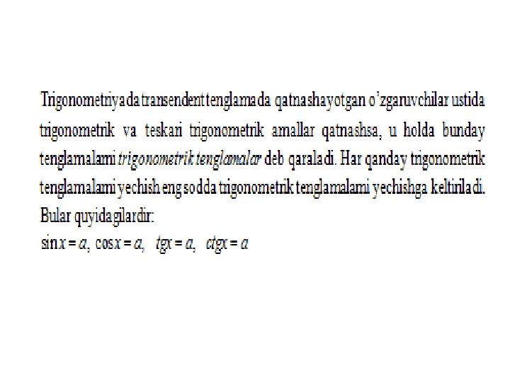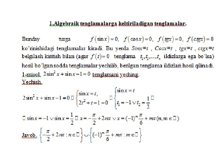 Trigonometrik tenglamalar va ularni yеchish usullari a) eng sodda trigonometrik tenglamalar; b) trigonometrik funksiyalarga nisbatan algebraik tenglamalar; v) ikki funksiyaning tenglik sharti; g) bir jinsli tenglamalar. Trigonometrik tenglamalar va ularni yеchish usullari MMMYe. M fanidan 31. 10. 2019 dagi ochiq dars Saparboyev Jamoladdin Yuldashevich