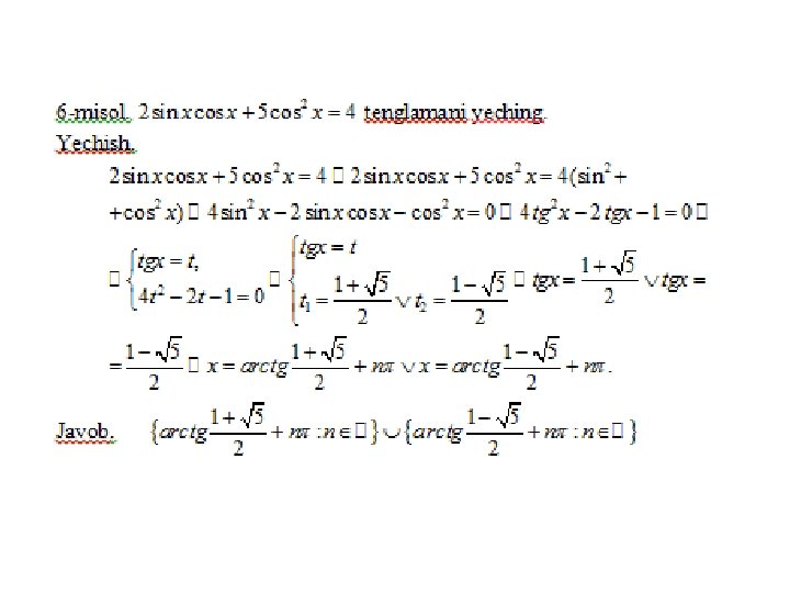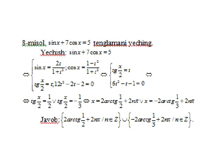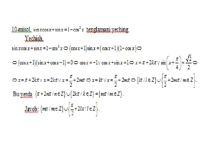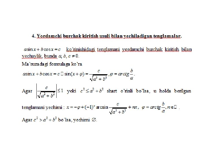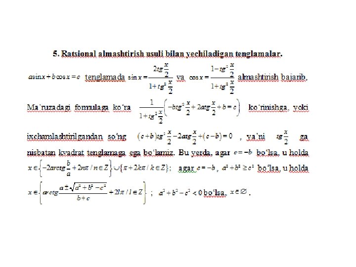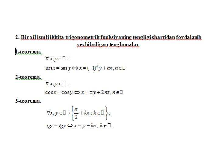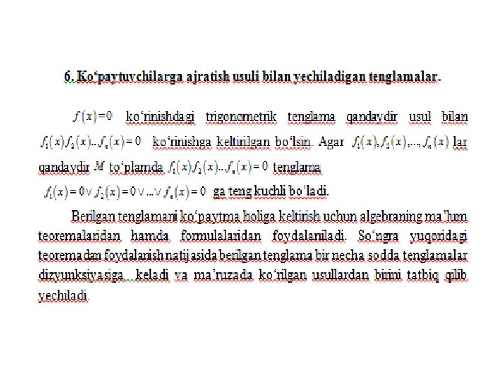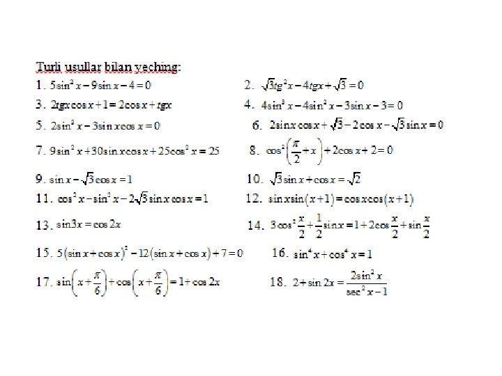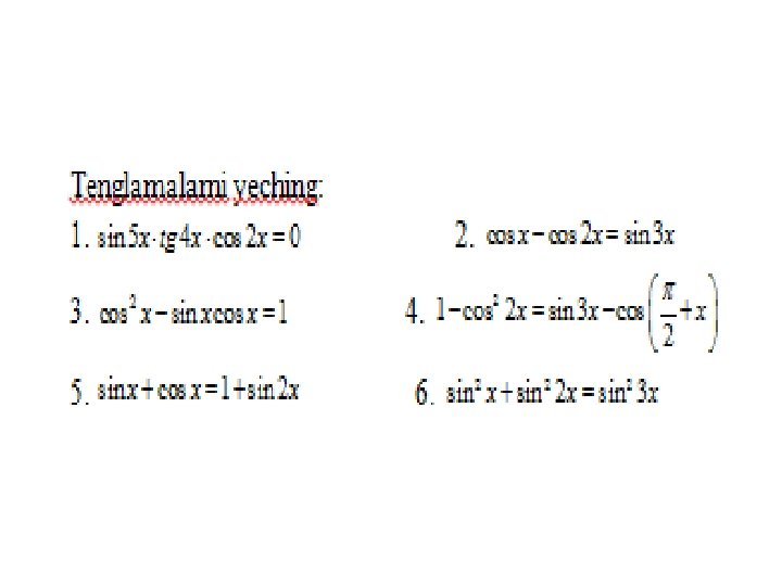 • Online ishlovchi internet sayti: trigonometrik tenglamalarni yechish usullarini o’zlashtirganliklarini aniqlovchi https: //www. yaklass. ru/p/algebra/10 klass/trigonometricheskie-uravneniia-9145/metodyresheniia-trigonometricheskikh-uravnenii-9134 • O’zbek tilida trigonometriya. Umuman matematikadan bilimlaringizni tekshiruvchi online internet dasturi sayti http: //www. abt. uz/training/index