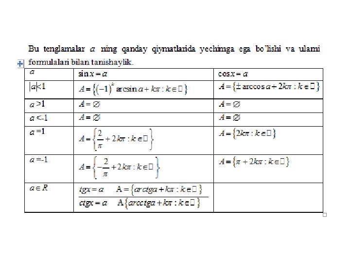 Trigonometrik tenglamalarning turlari bilan tanishishdan oldin quyidagilarni ta’kidlab o’tamiz. Tenglamalarni yechish jarayonida ba’zi bir shakl almashtirishlar bajariladi. Agar bunday almashtirishlar tenglamalarning teng kuchliligiga doir teoremalarga asoslangan bo’lsa, u holda hosil bo’lgan tenglamaning yechimi berilgan tenglamaning yechimi bo’ladi. Aks holda yechimlar tekshirilishi kerak. Trigonometrik funksiyalarning aniq bir qiymatini beradigan argumentning qiymatini cheksiz ko’p bo’lmaganligi uchun tenglamaning bir xususiy yechimini olgandan so’ng umumiy yechim formulasi hosil qilish mumkin.