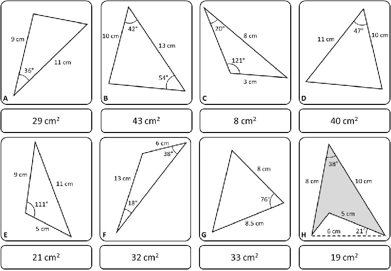 Trigonometry – Area Rule – Card Match In this activity students work individually or in groups to match questions and answers. ‘Quick Cut’ – Choose the questions/slides you wish to use and delete others. Sets of questions can then be easily guillotined to save time. One-sheet sets of cards are also included for students to cut out themselves.