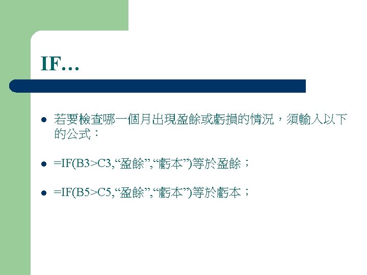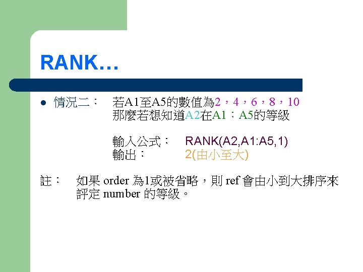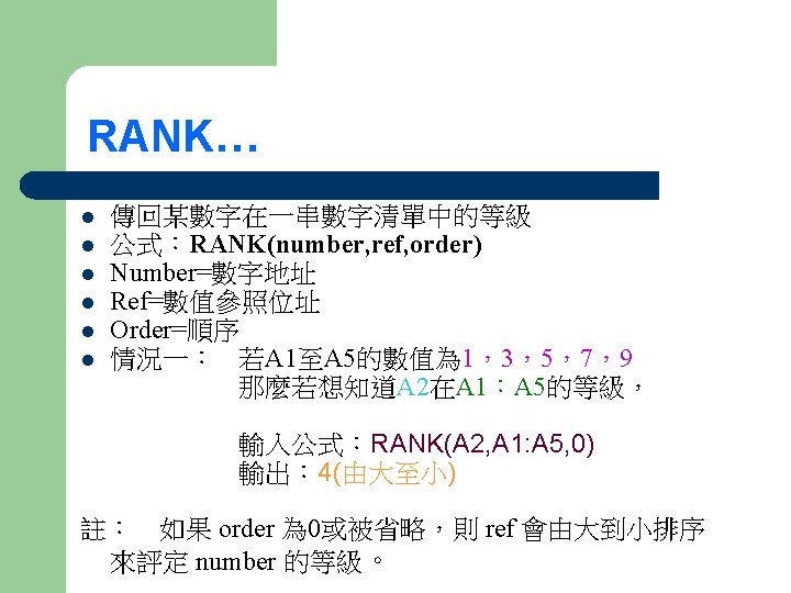 TRIM RANK SUMIF IF TRIM l l TRIMtext Slides: 8 Download presentation 試算表函數簡介…. . TRIM RANK SUMIF IF TRIM… l l 移除文字串中多餘的空格,並保留一個空白字元 公式:TRIM(text) 例子:TRIM(" Work hard and play hard ") 輸出:“Work hard and play hard" IF…