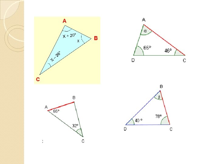 • Según sus lados: -Escaleno: Es aquel que tiene todos sus lados distintos, a b c. Ejemplo: -Isósceles: Es aquel que tiene 2 lados iguales y una base. Además tiene 2 ángulos iguales Ejemplo: CBA = BAC = a (Base )
