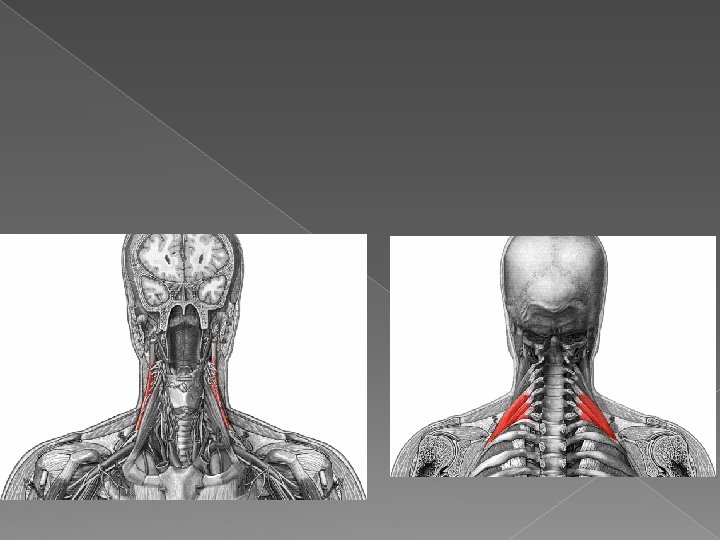 Músculos del cuello � Escaleno medio: O: apofisis tranversas de C 3 a C 7. Inser: cara sup. de la 1° costilla. � Fx: inclinación lateral del cuello. � Escaleno posterior: O: apófisis transversas de C 4 a C 6. Inser: borde externo de la 2° costilla. � Fx: flexion del cuello lateralmente.