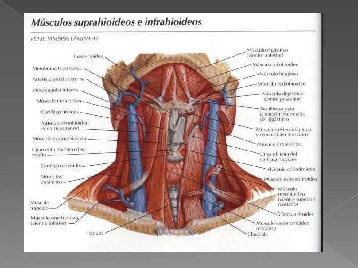 Tirohioideo � O: línea oblicua del cartílago tiroides. � Inser: cuerpo y asta mayor del hioides. � Fx: desciende el hioides y la laringe.