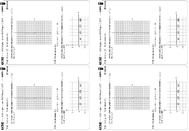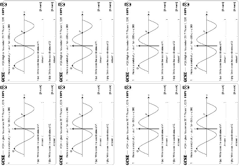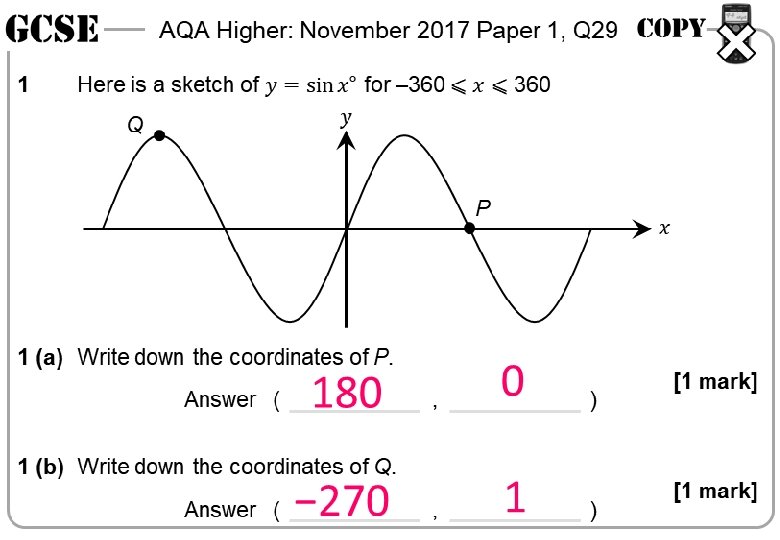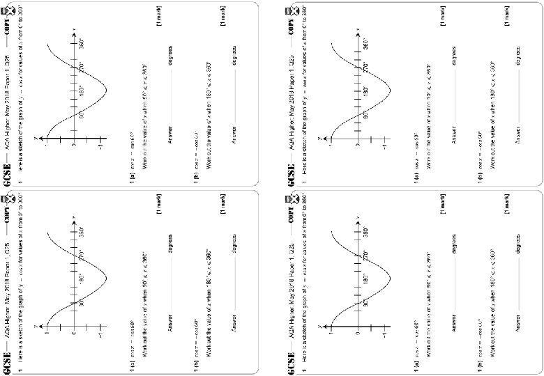AQA Higher: May 2018 Paper 1, Q 25 1 1 0 90° 180° 270° 360° − 1 1 (a) [1 mark] Answer degrees 1 (b) [1 mark] Answer degrees