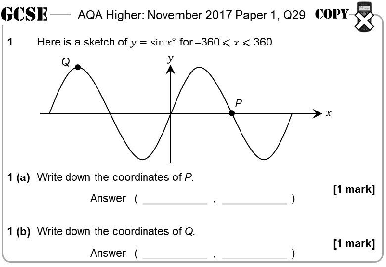 AQA Higher: May 2018 Paper 1, Q 25 1 1 0 0 90° 180° 270° 360° 90° − 1 180° 270° 360° − 1 1 (a) [1 mark] Answer [1 mark] degrees Answer 1 (b) degrees 1 (b) [1 mark] Answer degrees