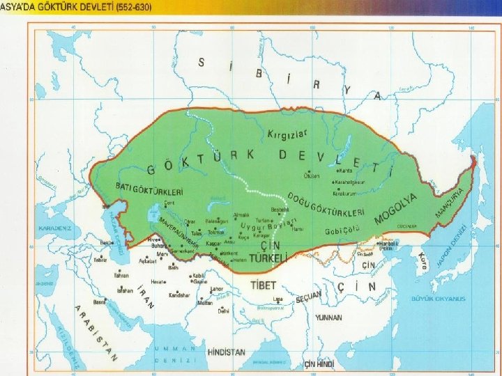 GÖKTÜRKLER ü İlk kez Türk adını bu devlet taşımıştır. ü Ülke prensler arasında paylaşılmıştır. Ülkenin doğusunu Bumin Kağan, batısını İstemi Yabgu yönetti. ü Batı Türkistan’ın Türkleşmesini sağladılar.