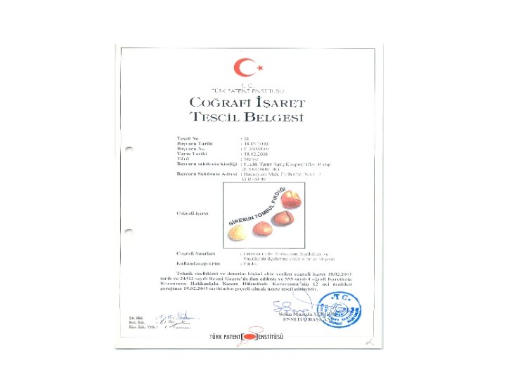 Coğrafi işaret olarak tescil edilecek ürünün üretimi, işlenmesi ve diğer işlemlerinin: üTamamı belirlenen alanda gerçekleşiyorsa üEn az biri bu alanda gerçekleşiyorsa üTüm/esas nitelikleri bu yöre kaynaklı ise üÜnünün buradan kaynaklanması yeterli üMENŞE ADI üMAHREÇ İŞARETİ Giresun tombul fındığı Isparta gülü Hereke halısı Trabzon ekmeği 6