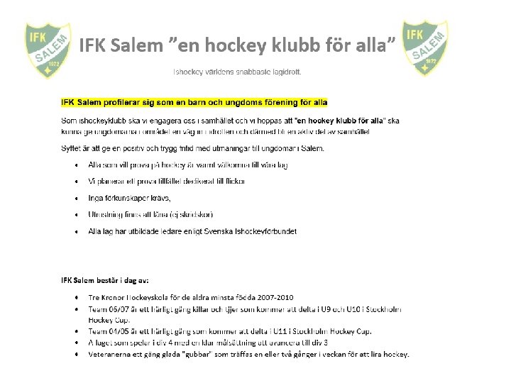 KORT VERKSAMHETSBERÄTTELSE SÄSONGEN Styrelsen för IFK Salem har sammanträtt totalt 11 gånger under verksamhetsåret. Ekonomi IFK Salem har sedan flera år en stabil och sund ekonomi som bygger på bra kontroll på kostnader och intäkter, där våra lagbudgetar har en mycket central plats. Detta verksamhetsår har vi fått en markant löneökning på personal vilket har lett till en negativ trend på budget. Kostnaderna och intäkterna för lagen och föreningen som helhet har även denna säsong i stort sett följt budget. Det aktiva arbete med marknadsföring och sponsring har bidragit till 30 000 kr, samt att Disco och IFK Salems dagen ökade intresset och intäkter. Övrigt Ishalls AB fortsatte att förlänga säsongen. Medlemmar Antalet medlemmar vid årets slut totalt ca 190 st. I dessa innefattar även medlemmar boende utanför Salems kommun, men innefattar ej familjemedlemmar. Personal Föreningen har haft 2 vaktmästare anställda under säsongen. 2 tills vidare anställda och en visstidsanställd. En av de tills vidare anställda går i pension nu i juni så vi anställer Martin Karlsson som var provanställd under året som säsongsanställd Aug 15 -mars 16. Alva som kanslist samt timanställd städ hjälp. Tårtbits-hockey IFK Salem är också drivande i tårtbits möterna mellan andra ishockey klubbar i när regionen