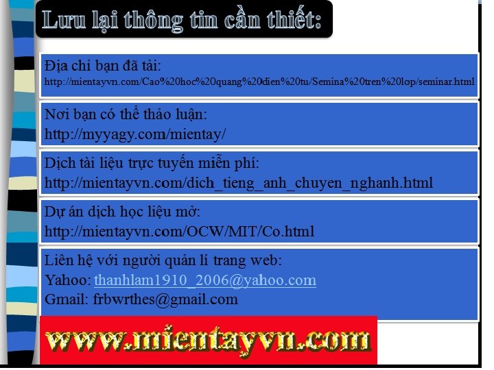 Lưu lại thông tin cần thiết: Địa chỉ bạn đã tải: http: //mientayvn. com/Cao%20 hoc%20 quang%20 dien%20 tu/Semina%20 tren%20 lop/semin Nơi bạn có thể thảo luận: http: //myyagy. com/mientay/ Dịch tài liệu trực tuyến miễn phí: http: //mientayvn. com/dich_tieng_anh_chuyen_nghanh. html Dự án dịch học liệu mở: http: //mientayvn. com/OCW/MIT/Co. html Liên hệ với người quản lí trang web: Yahoo: thanhlam 1910_2006@yahoo. com Gmail: frbwrthes@gmail. com